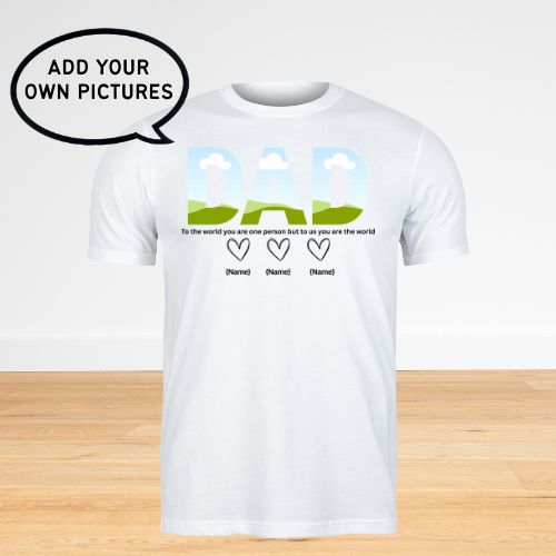 Just in time for Father's Day, this t-shirt can be customized with photos within the "Dad" lettering. The name or names can also be customized to the bottom of the shirt.