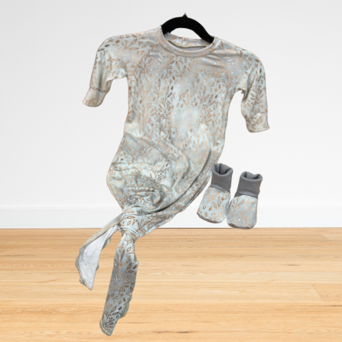 This knotted sleeper with matching booties is beautiful. Made with buttery soft bamboo fabric, this sleeper is cool and breathable so baby can wear it in any weather. Extremely lightweight with a comfortable stretch, this gray with gold accents color is a perfect neutral color.